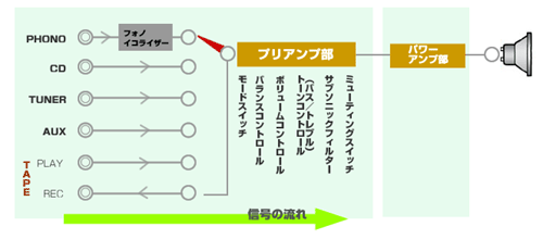 音楽信号の流れにそって、ひとつひとつ機能をみていきます。下の図は一般的なプリメインアンプの基本構成です。