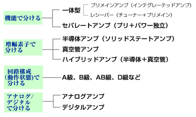 スピーカーには密閉式やバスレフ。また2ウェイ、3ウェイというのがありましたね。アンプの場合も同じで、色々なタイプに分かれるのです。分ける際のポイントは、何によって分類するのかです。図1を見てみましょう。
