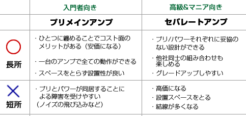 さあプリメインとセパレート、どっちがよいのか。それぞれの長所・短所を表にまとめましょう。これは表裏一体で、見方によって評価がわかれるはずですね。プリメインはワンボディ化することですべての操作を集中でき、なおかつ設置スペースも少なくてすみます。信号経路を最短にできるというメリットもあります。でもデリケートな信号を扱うプリと大電力駆動のパワーとが同居するということは、ノイズの飛び込みや相互干渉上不利となるのは避けられません。