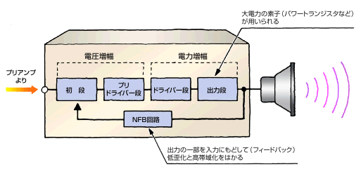 プリアンプについては、前回ブロック図で解説しましたね。ではパワーアンプの方はどういった構成になっているのでしょうか。