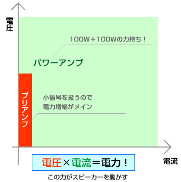 ところでプリは電圧増幅、パワーアンプは電力増幅の役目なのですが、イマイチその違いがハッキリしないネという方もいるでしょう。それを解説したのが図4です。縦が電圧、横が電流。それぞれどう大きさが違うかというと、プリアンプの方は小信号を扱うので電圧増幅がメインです。縦に伸びて電流は微々たるもの。でもメインアンプは違います。「電流×電圧=電力」という公式を理科の授業で学んだはずですが、この力(面積)がスピーカを動かすもと。なので電流をたっぷりと流し、熱を出しながらがんばっていますね。だからヒートシンク(放熱板)が必要なのです。