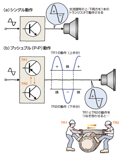 さてプッシュ(Push)とプル(Pull)の動作。この押したり引いたりをひとりでやるのは大変と、作業を二人の分業にしたらどうでしょう。図2(b)では、上下にTR1とTR2がペアを組んでセットされていますね。始めの半サイクル(+)はTR1が「ボクの番さ」とばかりに働くと、その間TR2は休んでいます。次の半サイクルではこれが逆転。寝ていたTR2がムクリと起き出して働き、今度はTR1がおネムの時間。その繰り返しです。このTR1とTR2の動作をつなぎ合わせることで、大きな出力が得られるという仕組みです。