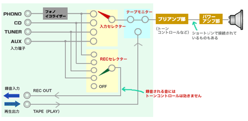 似たような名前でゴチャゴチャしそうですね。録音機についてはのちほどまた「放送&録音編」でまた解説する予定ですが、ここで図を見ましょう。アンプの入力系で、特に録音/再生にかかわる部分を抜き出しました。ここで大切なのがRECセレクター。入力端子からはCDやチューナーなどいろんなソースの音が入ってくのですが、それを選んでRECアウト端子(録音出力端子)から出力してあげるためのスイッチが「レコセレ」などと呼ばれるRECセレクターです。