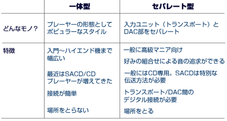 一方トランスポートとDAC部を分離したのがセパレート型です。マニアむけに特化してとことん音を磨きあげようとういうスタンス。製品数は、特にトランスポートが少なくDACの方も以前ほどバラエティに富む品揃えが難しくなってきています。もともとはプロの世界からきたもの。一体型プレーヤーの精度や完成度が高まったことが理由といえるでしょう。トランスポートとDAC間の接続が必要だったり、場所をとるなどの問題もあります。また一般にはCD専用というケースがほとんどで、SACDはそのメーカー独自のリンク(例えばデノンリンク)が必要だったりします。