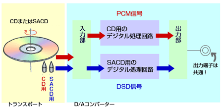このSACD/CDプレーヤーで、CDを読み込んだときは、図の「赤」の系統で信号が流れます。SACDソフトなら「青」の流れです。ハイブリッドディスクをかけると、普通はSACDエリアを優先して読みにいくので、あれこれ迷うことはありません。音比べでCDエリアを聴くような場合は、ディスクを一旦停止して、そこでSACD/CDの切り替えキーを操作しましょう。
