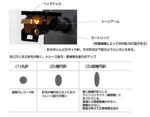 興味深いのが針先の形状でしょう。標準の丸針(デノンのDL-103が代表)のほか、それを細長くした楕円針、さらに超楕円形状にしてラインコンタクト(線接触)に近づけたものなど、何タイプかに分かれます。