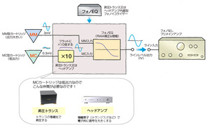 実際の製品は、プリメインアンプの中にフォノイコや昇圧アイテムまで収めた一体型や、フォノなしのプリメイン(ラインアンプ)と組むために、単体のフォノイコも用意されていますよ。さらにフォノイコも、製品によってMM入力だけのものや、昇圧トランスを内蔵したMC対応のモデルがあり、前者なら別途単体の昇圧トランス(またはヘッドアンプ)が必要。というように組合せはいくつかのタイプに分かれます。