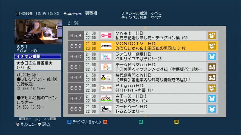 従来のスカパー!HDチューナー製品に比べて番組表がかなり使いやすくなっており、検索機能が充実しているので、探したい番組も次々と見つけることができる。