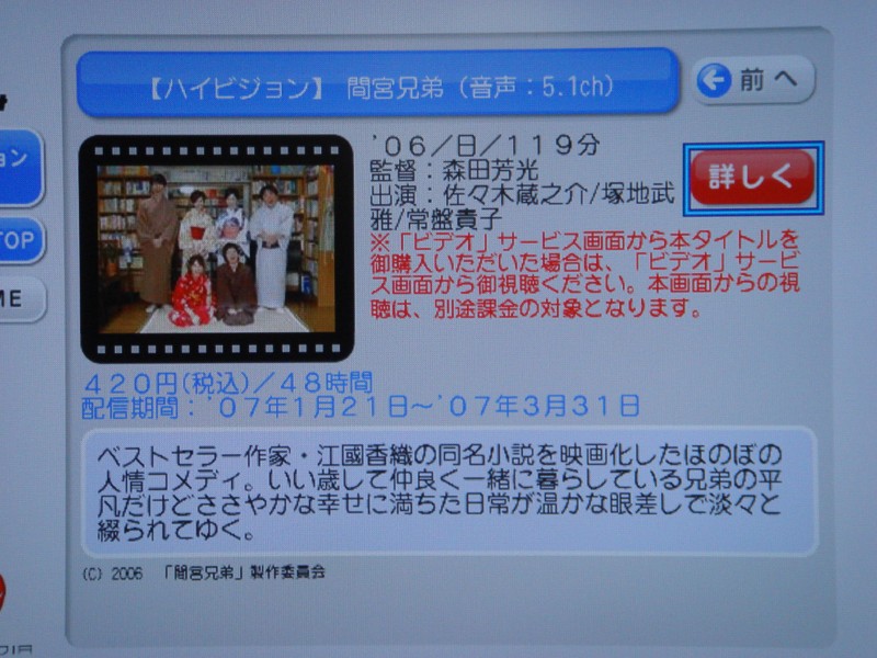 再生テストに選んだのは2006年の話題作『間宮兄弟』だ。佐々木蔵之介氏と、ドランクドラゴンの塚地武雅氏が、ひょうひょうと日常を過ごす兄弟を演じた、のんびりとした気分になれる作品。日常の慌ただしさから解放されて、ほっと一息をつくのに良さそうだと選んだ。