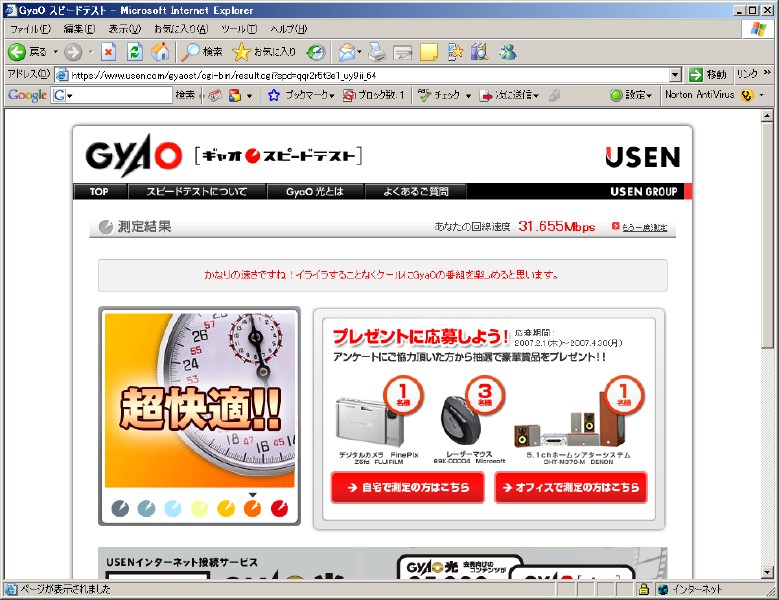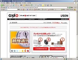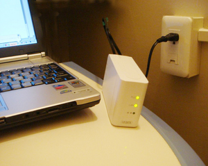 子機をコンセントに差し込みパソコンとLANケーブルで接続する。これであっさりとインターネット接続が完了した。気になる通信速度を無料動画配信サイト「GyaO」のスピードテストを使って計測した。テスト環境はNTT東日本のBフレッツ・マンションタイプで契約している。