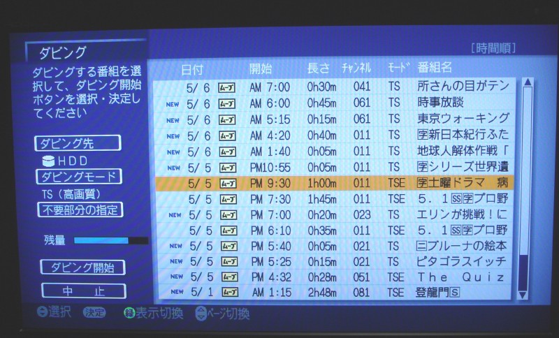 操作は「べんり」ボタンで機能一覧を表示させ、ダビングを選べば簡単に作業を進められる。では実際に録画番組のムーブを行ってみよう。テストはTSモードで録画した30分の番組を内蔵HDDからiVDR-Sにムーブする。さらに同じ番組をiVDR-Sから内蔵HDDへムーブして、それぞれのタイムを計測した。