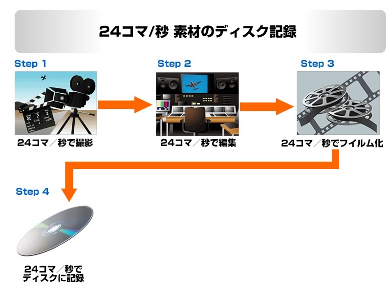 渡辺氏:Blu-ray Discビデオ(以下、BDビデオ)やDVDビデオの作成もフィルム映画の上映と流れは同じですが、ディスクに記録する際には24コマ/秒で記録します。BD、DVDともにディスクに記録されている状態はフイルムと同じなのです。