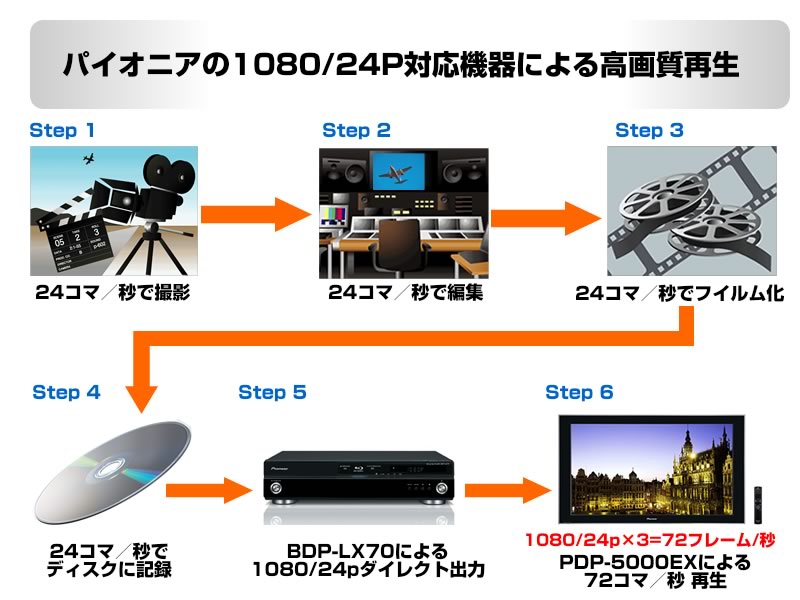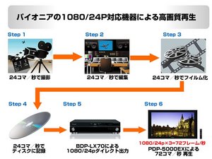 渡辺氏:「BDP-LX70」は1080/24pダイレクト出力の実現により、24コマ/秒のフイルム映像が持つ雰囲気をそのまま再現できるようになりました。この24pダイレクト出力の機能に、72Hz駆動(24×3)に対応するパイオニアのプラズマディスプレイ「PDP-5000EX」を組み合わせることにより、高品位な1080/24p映像を楽しむことができます。