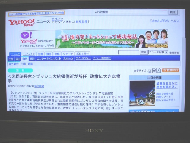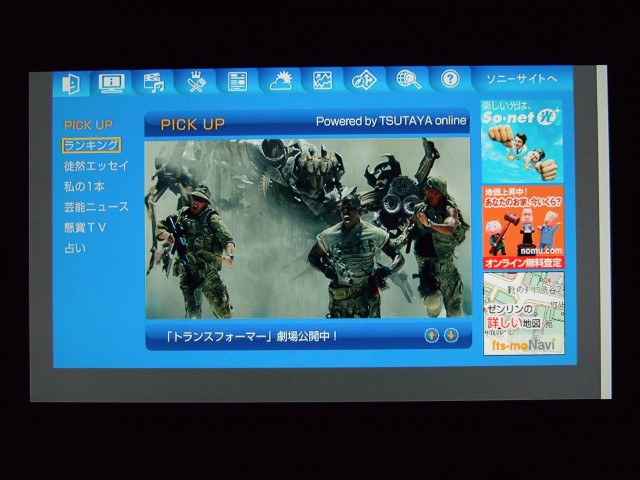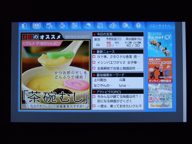 テレビ専用のポータルサイト「アクトビラ」に対応。アプリキャストがソニー独自のサービスなのに対して、アクトビラはパナソニック、シャープ、東芝など家電メーカー各社のテレビでも利用可能なサービスだ。通常のWebコンテンツよりもテレビで利用しやすく、リモコンでの直感的な操作が可能な親和性の高いレイアウトになっている。