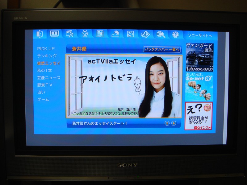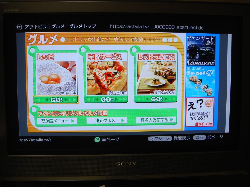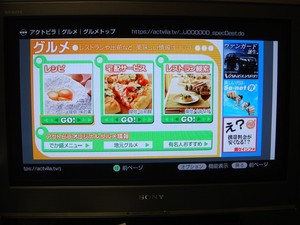 現在、アクトビラには静止画と文字情報のみの「アクトビラ・ベーシック」とSD画質での動画配信が可能な「アクトビラ・ビデオ」、HD画質での動画配信が可能な「アクトビラ・ビデオ・フル」がある。残念ながら本機は動画配信に対応していないので静止画とテキストの「アクトビラ・ベーシック」しか利用できない。