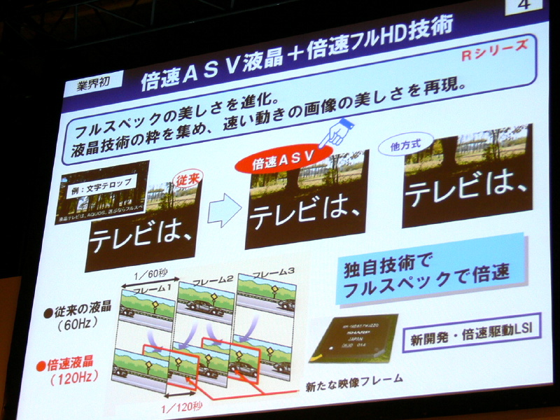 (1)倍速駆動:倍速駆動とは1秒間に60コマで表示しているテレビの映像を、倍の120コマとして表示することで残像を軽減する、液晶テレビの動画表示を向上させるための機能だ。各社で呼び名が少し異なるので注意したい。従来の液晶では高速で左右にスクロールする文字がぼやけて読みづらかったが、倍速対応の製品は輪郭がシャープになり、映像の視認性が高くなる。一般にスポーツ中継など、動きの激しいシーンで効果があると言われるが、筆者が視聴したところでは画面全体の引き締め効果があった。フルHD対応パネルだけでなく、倍速駆動の機能を搭載した製品では、よりシャープな映像を楽しむことができる。