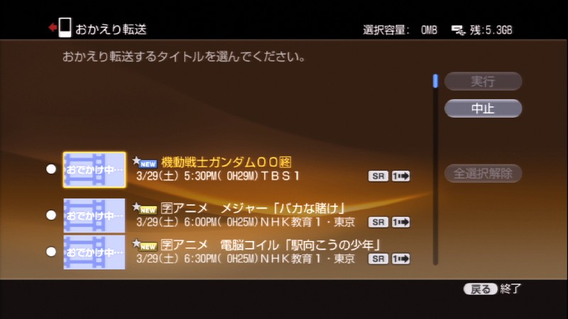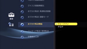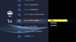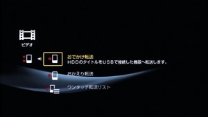 PSPは「メインプロファイル」という、どちらかと言えば画質優先の方式を採用している。一方ウォークマンや携帯電話では「ベースラインプロファイル」という、再生のデコードに負荷がかからない方式が採用されていた。PSPの方が画面が大きく、メインプロファイルレベルの高画質映像が求められる。MPEG-4 AVCの映像ファイルは、高画質を求めるほどに、再生機器に搭載されるデコーダーに高い性能が要求されるため、携帯機器でメインプロファイルに対応するのは困難とされている。一方のベースラインプロファイルは画質はメインプロファイルに比べて劣るが、処理能力の低い機器でも再生できるというメリットがある。この「おでかけ転送」機能はとても便利なのだが、このためだけにPSPを買う人は少なく、こまではいまひとつ認知が拡大してこなかったように思う。しかし今回は“ウォークマン”をはじめ対応機器が増えたことで、よい多くの人々が機能を使いこなせるようになるのではないかと考えている。ではBDZ-A70による「おでかけ転送」機能の使い方をご紹介しよう。