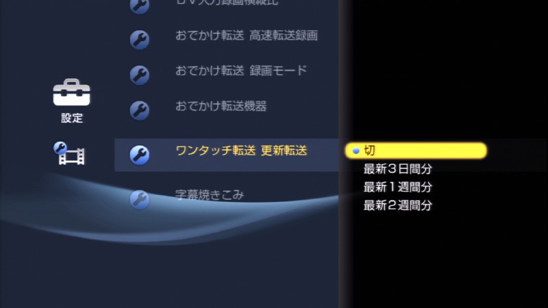 「おでかけ転送」自体の使い勝手はPSPもウォークマンも変わらない。便利だと感じたのが「ワンタッチ転送」機能だ。これは転送対象を接続し、本体の「ワンタッチ」ボタンを押すだけで自動的に指定した番組が転送される機能。たとえば深夜や早朝のニュースを毎日更新で録画し、ワンタッチ転送に設定しておく。翌朝ウォークマンやPSPなどを接続して、本体のワンタッチボタンを押せば、本体の電源が入っていなくても転送がスタートする。この機能には自動更新機能があり、「最新3日間」「最新1週間分」「最新2週間分」で上書き更新できる。これまでは見終わった番組を消すのが面倒だったが、ニュースや連続ドラマなどを自動的に最新のものに書き換えてくれるので、日常的に使う人は重宝するだろう。ちなみに上書きされるのは転送先のコンテンツであり、BDZ-A70上のコンテンツは上書きや消去はされない。