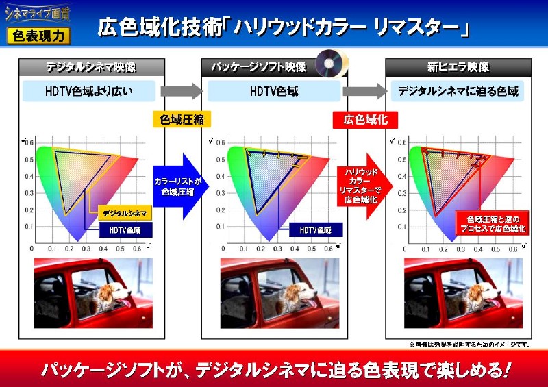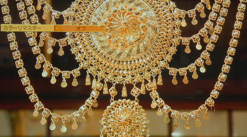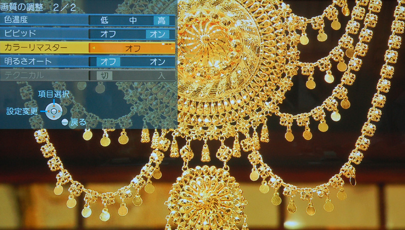 パナソニックでは広ダイナミックレンジで豊かな色数など、映像情報量の多いブルーレイシネマを描ききる今回のVIERAシリーズの映像について「シネマライブ画質」と称して、その魅力をアピールしている。発色についてはハリウッドのカラーリストによる監修を受けており、映像のプロからもお墨付きの画質になっているという。広色域化の効果は、金色の発色でとくに発揮されるとのことで、実際に今回見せてもらったデモ映像では、その違いがはっきりと確認できた。映像の比較はテレビのメニューから「カラーリマスター」のON/OFFを切り替えて行ったが、機能をONにして広色域で表示した金色は、すこし暖かい色味が乗り、より深みのある色表現となる。一方、機能をOFFにした従来の映像では、純金というよりは金メッキに近い、軽い輝きになっていた。