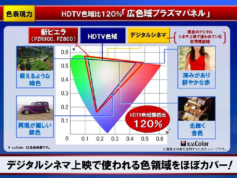 ■PZR900シリーズ「画質の魅力」 「ビエラシリーズは既発売のPZ800シリーズで“ハリウッド画質”を提案し、多くのユーザーにご好評いただいております。PZR900シリーズでは、テレビ本体に録画機能を搭載することで、新しいテレビの楽しみ方を提案したいと考えました」(山口氏) 画質については2008年4月発売のPZ800シリーズで完成の域に達しているという。本シリーズではハリウッドにあるPHL(パナソニックハリウッド研究所)で蓄積されたノウハウを積極的に取り入れたという。さらに今回ラインアップを一新したBDレコーダーのDIGAシリーズとも画質面でより積極的な連携をはかり、より美しい映像再現を可能にしている。 「BDレコーダー“DIGA”シリーズでは、映像の色信号を忠実に送り出すための高画質再生技術“ハリウッドクリアカラー”を搭載しました。DIGAから送り出された映像信号は、ハリウッドのカラーリストの技術を応用して開発された“ハリウッドカラーリマスター”搭載のVIERAシリーズで再現することにより、BDに記録された色信号を広色域化して表示します。この広色域化により、HDTVの色規格の色域面積比で約120%という鮮やかな発色でBDソフトを楽しむことができます。プラズマは液晶に比べてコントラスト比が高いのが特徴ですが、PZ800シリーズ、PZR900シリーズの暗所コントラスト比は30,000対1を実現しているので、漆黒からきらびやかな金色の輝きまで余すことなく表現します。コントラストだけでなく、動画解像度は900本以上あります。これらのスペックはプラズマだからこそ実現でるものです」(山口氏)