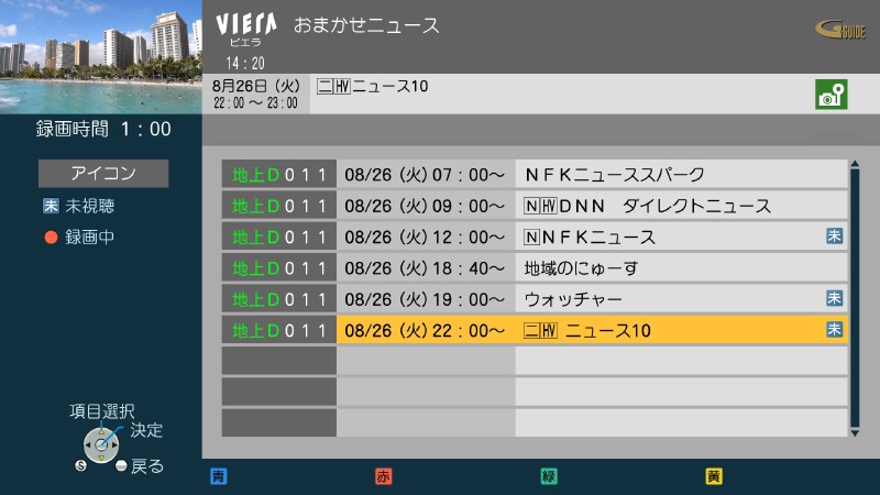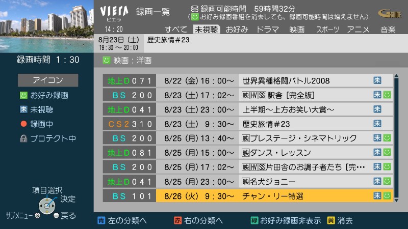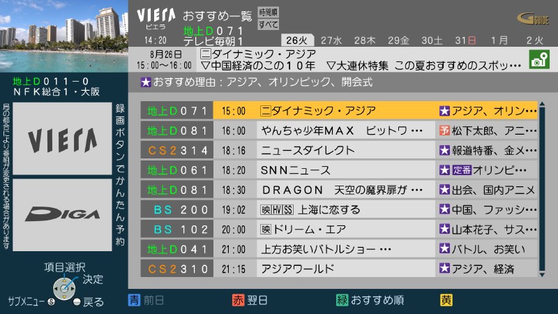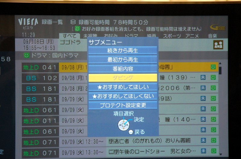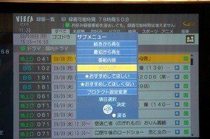 ハリウッド映画と言えば、インディージョーンズシリーズ、パイレーツ・オブ・カリビアンシリーズ、ハムナプトラシリーズなど、金銀財宝が物語の重要な要素として登場するが、それらをより美しく表示して楽しませる能力がテレビに求められるとすれば、VIERAの実現した機能の重要性は大きい。画質は総じてしっとりしており、解像感も十分。濁りのない発色はこのクラスのテレビの中ではズバ抜けて良いと感じた。 ■PZR900シリーズ「録画機能の魅力」 続いて筆者が最も注目している、PZR900シリーズの録画機能を見てみよう。内蔵するHDDはなんと「1TB」。BSデジタル放送なら約86時間、地デジの放送なら約121時間ものハイビジョン放送が録画できる。これならば家族でHDDを共有しても不足は感じないだろう。驚いたのはキーワードやジャンルによる「自動録画機能」を備えていること。入力した情報に関係する番組をHDDがいっぱいになるまで録画しまくるのだ。そして、HDDが録画番組でいっぱいになったら、古い番組を消して上書き録画をする。ユーザが任意で録画予約した番組があれば、そちらが優先され、古い番組を消去して録画を行う。要は1TBの容量を遊ばさない設計になっている。「番組表から見たい番組を探す」のではなく、「録画済み番組から見たい番組を探す」という使い方ができる。これはテレビ好きのユーザーにはたまらない使い勝手だ。 ただ録画するだけでなく「おまかせニュース」機能を使えば最大6時間分のニュース番組を録画する。常に新しいニュース番組に上書き更新されるので、いつでも最新の情報がチェックできる。