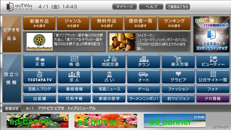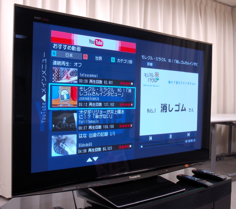 テレビのHDDからBDレコーダーへのムーブは、筆者がかねてから強く期待していた機能だが、ようやくパナソニックから搭載機が登場してほっとしている。テレビからレコーダーまでの転送に実時間がかかることを考えると、確かにあまり頻繁に使う機能ではないかもしれないが、録画コンテンツの将来性を考えても必ず役立つ機能である。この録画機能については近日中にしかりとチェックする予定だ。 ■PZR900シリーズ「ネット連携機能の魅力」 最後にVIERAのインターネットと連携した各機能を紹介しよう。PZR900はハイビジョンの映像配信サービス「アクトビラビデオ・フル」だけでなく、動画共有サービス「YouTube」との連携機能にも対応している。今回体験したデモでは、当然再生される映像はハイビジョンには及ばないものの、50インチの大画面でも意外に楽しめる画質だったのには驚いた。いつもはパーソナルな環境で楽しむことが多い動画投稿サイトの映像を、大画面で楽しめる体験は新鮮だった。テレビ番組の視聴に飽きた時などに重宝する便利な機能だ。