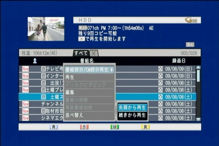 通常、録画したい番組を選んだら、次にその番組を毎回録画するのか、単発なのか選択しなければならない。さらに画質だ。高画質で残したい番組なら「DR」を、ドラマやアニメを1枚のBDやDVDにまとめて保存したいならMPEG-4 AVCで録画するなど、あらかじめ保存するメディアのことも考えて録画モードを選びたい。しかし本機はそういった細かな操作がワンステップでは行えない。もし毎週録画にしたいなら、一度予約を終了させて、リモコンのフタを開け、「スタートメニュー」から「予約一覧」を表示させ、さらに個別の予約を選択して、録画の詳細を変更し直さなければならない。筆者は録画内容の7割以上が毎週予約なので、この一連の流れは受け付けなかった。