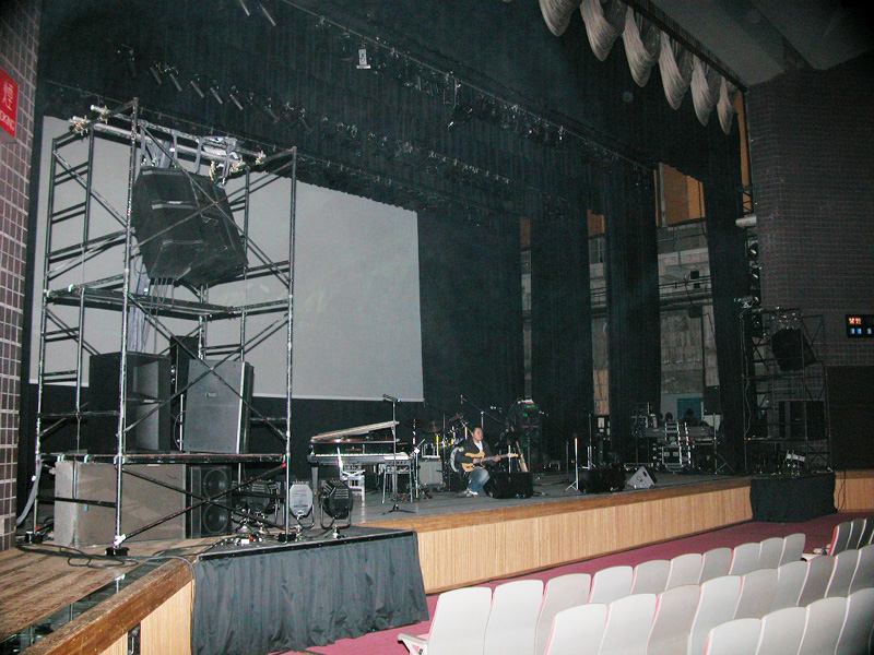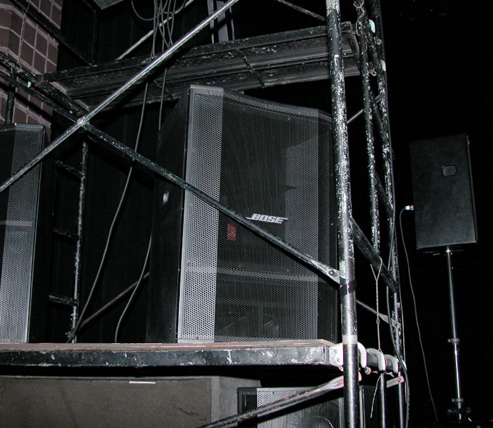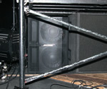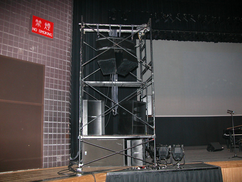 正面ステージに向って左右に設置されたスピーカーの内容をそれぞれにご紹介しよう。写真からご覧いただけるシステムの最上段に設置されたスピーカーシステムが「Panaray