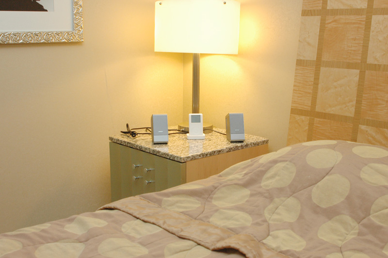M3のセッティングは至って簡単だ。2つのスピーカーを専用のケーブルで繋いで、電源ケーブルをコンセントに接続。あとはデジタルオーディオプレーヤーやPCなどをステレオミニジャックのケーブルで繋ぐだけだ。今回持ってきたプレーヤーは35GB分の音楽を詰めこんだiPod。どうせ聴くなら高音質な方がいいと思い、LINE出力が可能な専用Dockも一緒に持ってきた。iPodのバッテリーは機内で使い切ってしまっていたので、MacのノートPCと繋いで充電しながらM3に接続することにした。