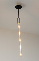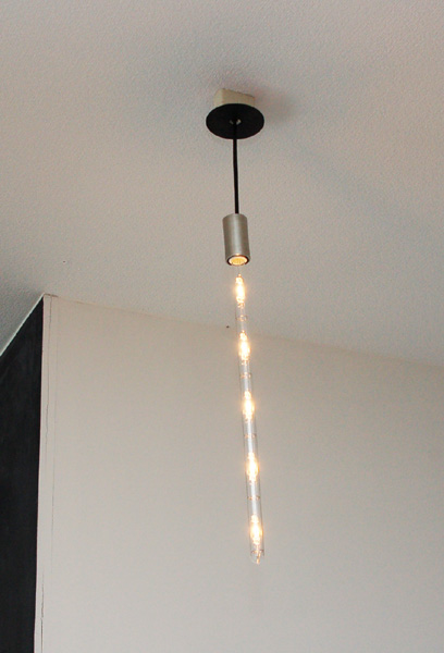 こちらは店内の照明器具。CDシングルの板と水道管のパイプを組み合わせるなど工夫を凝らし、つくりあげたオリジナルのアイテムだ |