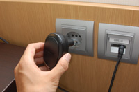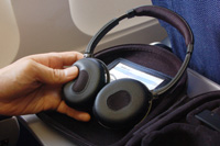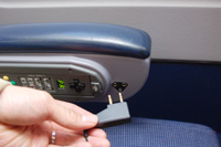機内エンターテインメントには付属の専用プラグでつなぐ。今回はデュアルタイプで装着できた |