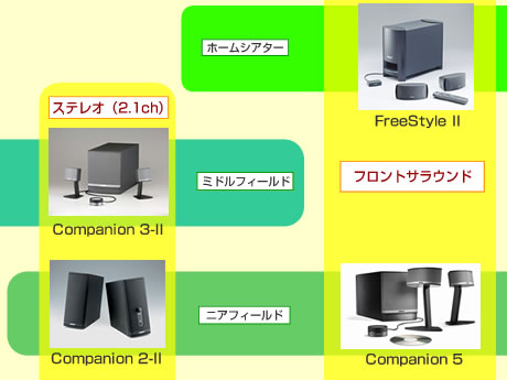 “Companionシリーズ”には大きく分けて、デスクトップ環境での使用を想定したニアフィールドタイプと、6から8畳程度の部屋全体に音を広げて楽しむミドルフィールドタイプがある。