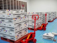 ●1台1台を開梱、電源ケーブルを配線しながらAVラックへ収納していく |