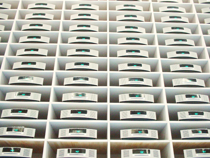▲1台1台のシステムから異なる楽曲が再生され、展示スペース内をホワイトノイズが包み込む |