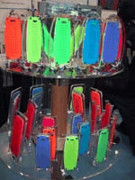 | ユニークな平面スピーカー、カラーは7色(左)。平面ユニットを使用したポール状の製品(右) |