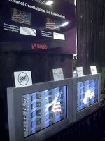 HOME > ニュース > オーディオニュース ■■■CESフォトレポート in LAS VEGAS (18)■■■ 公開日 2001/01/09 18:52 ●昨日に引き続き、1/6〜1/9に米国ラスベガスのコンベンションセンターや他の周囲の会場でも開催されている、ウィンターCEショーをフォトレポートします。質より量で勝負! どうぞ、目を凝らして見てください。(ホームシアターファイル編集部NN) (写真左)ファロージャは新開発デバイスDCDiをデモ。星条旗がはためく画像で非搭載モデルとの比較を行っていた。搭載機は色にじみがなく輪郭も自然だ (写真右)CANTON社のかんたんホームシアターシステム。会場のラスベガスヒルトンとコンベンションセンターはこのようなホームシアター用スピーカーで埋め尽くされていたような感がある この記事をシェアする