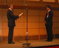 | 輸入オーディオ協議会記念表彰された8名の方々(左)。表彰状を授与される(株)音元出版 代表取締役社長 和田光征 |