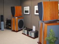 さて驚くのはマグナットの巨大なシステム。ヴィンテージ990という。610mmのサブウーファーを別ボックスに収め、その上に30cmウーファー付きの3ウェイが乗る形。サブウーファーとウーファーは内蔵アンプで駆動する。総重量は160kgにも上るという。見上げるような超重量級システムである。会場の狭いブースでは少々窮屈そうにも見えるが、音は実に堂々としたワイドレンジ。ともかく聴いてみるに越したことはない。。(井上千岳)