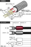 絶縁体にはPE素材、シースは鉛フリーPVC、ジャケットには難燃性ポリエステルを採用している。また、端末は真鍮削り出しロジウムメッキ製で8mmスペードラグ仕様となっている。芯線とラグは無鉛半田により接続され確実な伝送精度を実現している。