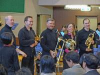 場所はTDK(株)の本社が所在し、また吹奏楽に熱心な東京都中央区の日本橋中学校で行なわれた。先ず日本橋中学校の吹奏楽部のマーチング演奏でコンサートが開始。続いて、ベルリン・フィルハーモニー・ブラス・クインテット<サラ・ウィリス(ホルン)、タマシュ・ヴァレンツァイ(トランペット)、ガボール・タルケービ(トランペット)、クリストハルト・ゲスリング(トロンボーン)、パウル・ヒュンペル(テューバ)>による演奏が行なわれ、日本橋中学校吹奏楽部とベルリン・フィルハーモニー・ブラス・クインテット合同の演奏、そして質疑応答と内容盛り沢山のミニコンサートとなった。