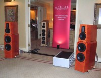 部屋中央に置かれていたのが、同ブランドのトップモデル20T。木目の美しい新仕上げモデルである。接続されているのはBOULDERのパワーアンプで、「AERIAL ACOUSTICSのスピーカーとは極めて相性がいい」と主宰者のマイケル・ケリー氏は言う。エンクロージャーの振動を極力排除して余分な色づけをなくそうというコンセプトのAERIAL ACOUSTICSの能力を発揮させるためには、高い駆動能力を持ったアンプを組み合わせてほしい、ということのようである。