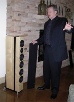 スピーカーシステムのPhi Seriesの大きな特徴は、エンクロージャーの天板と側板に大きな溝が入れられていること。この溝を設けることで、前後での振動の分割が図られているようである。