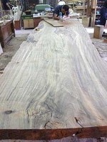 一台一台が圧倒的な存在感の銘木作品。昨年よりさらに台数を増やし、さまざまな樹種のさまざまな杢を、迷うほどに選ぶことができる。さらに清見の材料庫から大量の一枚板を搬入・展示。