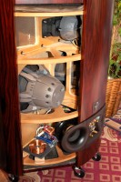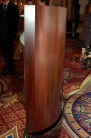 キャビネット外側の平面パネルは25mm厚のMDF製。曲面のパネルは、厚みの異なる2枚のMDFパネルで構成する。曲面を多用することでキャビネット剛性を高め、内部定在波の発生を抑えている。内部には複雑なブレーシング構造を採用し、振動によるカラーレーションを排除している。さらに、バッフル表面に天然レザーを貼っており、バッフル表面での音の吸収・拡散を図っている。
