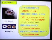 ウーファーとの音色を揃えるため、トゥイーターにもウーファーと同じウッドの振動板を採用。0.11mmの振動板を2枚貼り合わせ、厚さはこれまでの0.28mmから0.22mmとした。質量も0.14gから0.1gへ、40%の軽量化を図った。磁気回路は低歪のネオジウムマグネットを用い、16kGの磁束密度で駆動する。