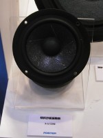 フォスター電機のブースでは例年数多くの新規開発品が発表されているが、今年最も目を引いたのは「傾斜抄紙技術」である。コーンの内周から外周へかけて2種類の素材の厚みを変えながら成型していく手法で、より低歪みでワイドレンジを得ることができるという。また、発泡マイカ振動板を使ったほとんど傾斜のない薄型コーン型ウーファーも面白い。フォスターはOEM専門だから、近い将来人知れずどこかのオーディオメーカーから採用製品が発売されることであろう。