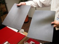 スピーカー用シート「SHシリーズ」については、現在同社サイトにアナウンスがあるように、10月中旬に向けたモデルチェンジが進められている。新たに型番「SH-22」として発売される製品のサンプルが今回のイベントに展示されている。前製品「SH-01」「SH-02」から変更された点は、材料の複合内容を変更することによって、製品の表面をよりきめ細かくし、制振効果が高められている。また、ユーザーから指摘のあった「臭い」の課題についても、新製品ではクリアされているという。