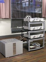 Aルームでまず気になったのはハイファイジャパンのブースである。50インチ薄型ディスプレイに大きさを合わせて開発されたという、モニターオーディオの新作「RADIUS250」の美しさも目を引いたが、もう一つ注目すべきはアコースティック・アーツのアンプとデジタルプレーヤーだ。高さ350mmの巨体を持つスーパーパワーアンプ「AMP−II」を筆頭に、マークIIかが図られつつあるのだという。主な改良点はS/N比の向上とか。高品位デジタル音源がごく普通となった現代のオーディオ環境で、アンプのDレンジ拡大はノイズレベルを下げることにある、というのが同社の考え方だそうである。