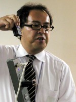 完実電気ブースにて。「ノイズ・ハーベストは、電源タップに差し込むだけで使えます」