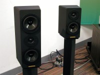 続いてCルームへ。ヘビームーンはPMCの新作スピーカー「wafer」が興味深い。一見すると薄型テレビの壁掛けに合わせたと思しき薄型キャビに小型ユニットをマウントしただけのシンプルなシステムに思われそうだが、キャビは同社の看板技術ともいえるアドバンスド・トランスミッション・ライン型が採用されている。また、縦置きと横置きの両方に対応するためにトゥイーターは縦横2カ所に取り付けられ、両方鳴らしてエネルギー特性をチューンすることも可能だという。